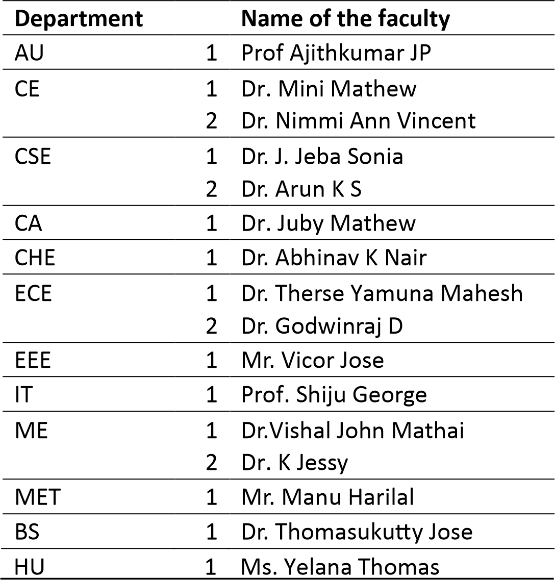 Amal Jyothi Research Council (AJRC) functions as an advisory body to support the AJCE Management in the promotion and administration of all Research, Innovation, Consultancy Entrepreneurship and Extension activities of the College. The council is headed by Dean (Research) who convenes the meetings fortnightly with representatives from all departments.